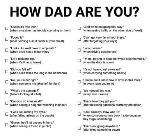 arrow-up11arrow-down1imageWhat's your Dad Score?lemmy.worldickplant@lemmy.world to Dad Jokes@lemmy.worldEnglish · 23 days agomessage-square33linkfedilink