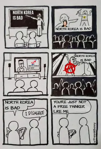 Fair enough. The original meme seems to suggest, though, not just that people are subject to propaganda, but that North Korea is, in fact, good.