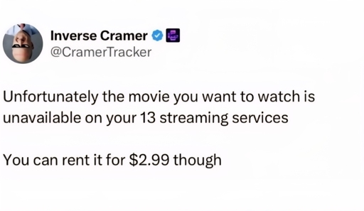 That being said the original meme on here did actually affect me last night. I really wanted to watch Quentin Tarantino’s grindhouse and apparently it’s unavailable on all streaming services but I could rent it for $3.99. really didn’t want to so I chose not to and watch something else instead.