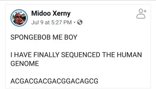 The laugh is a play on nucleobases of DNA; adenine (A), guanine (G), thymine, and cytosine ©, and thymine (T, not featured in the meme.)