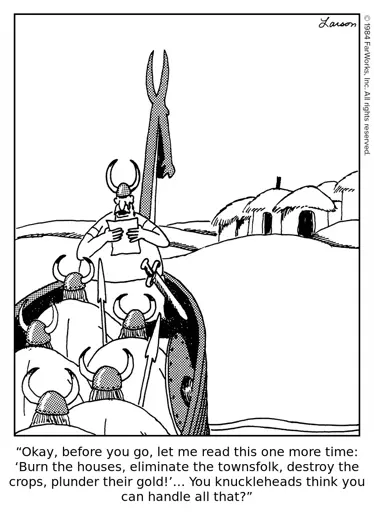 “Okay, before you go, let me read this one more time: ‘Burn the houses, eliminate the townsfolk, destroy the crops, plunder their gold!’… You knuckleheads think you can handle all that?”