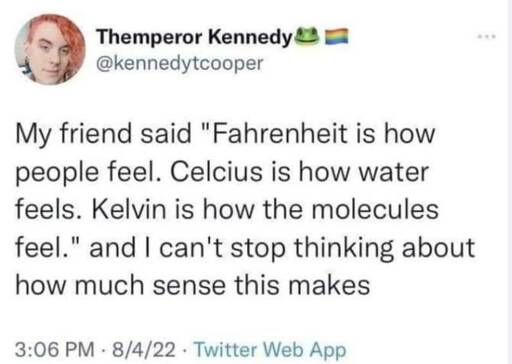“Fahrenheit is how people feel” only makes sense if said people have never used another scale. You know how 100F “feels” because that’s what you use. If you used Celsius you’d know how that scale feels instead, and be used to using the more useful scale generally.