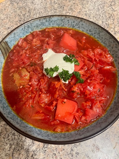 It is fantastic with sour cream and crusty bread. You can also make it vegetarian (just use veggie broth instead of water, this also saves 45 mins of cooking time).