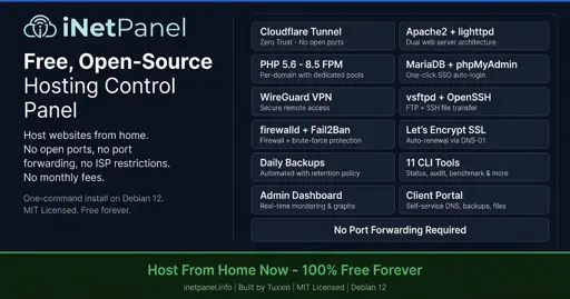 Self Hosted - Self-hosting your services.@lemmy.ml•[Promoting] Host Your Own Websites from Home — Free Control Panel for Debian 12 — iNetPanel